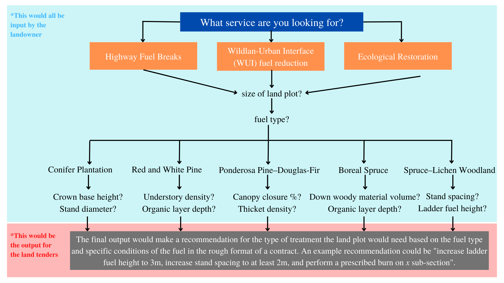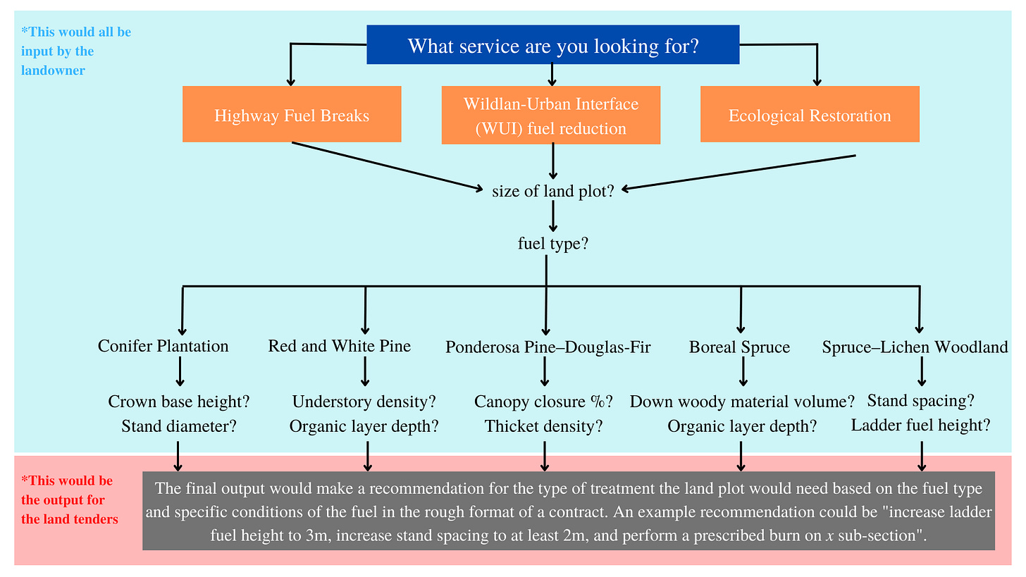 A large barrier to fuel reduction being done more quickly is the time it takes to write a prescription (a treatment plan for the forest based on its condition, for example tree density, length of ladder fuels, age of trees, crown height and density, etc.). It requires deep knowledge of forest science and the impacts of various vegetation types on wildfire behaviour. Even with this knowledge, it’s difficult to gauge exactly what treatment should be applied as there is no standard guideline as to what treatment is needed for what vegetation types or forest conditions. We want to minimize this bottleneck through our platform by automating the contract creation process (to the extent that it is feasible). The contract essentially lays out what the treatment plan is, who is going to do it, how long it will take, and how much it will cost. Although we are still unclear on what exactly this automation software will look like, we’re thinking of using a contract template that could be filled in by landowners when they are creating a job post through a question and answer interface. Based on the information gathered from that, the program would provide a recommended treatment plan formatted like a contract. That way, when land tenders or forestry professionals go to look for jobs, a rough treatment plan and contract would already be layed out and they would simply need to modify and perfect it according to their judgement. We created the following flow chart to illustrate roughly what this process might look like: